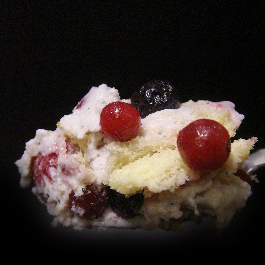 ブルーベリー味のジェラートに、サクサクとした食感のクッキータルトを挟み、ブルーベリー、フランボワーズ、グロゼイユの3種のベリーでデコレーションしました。