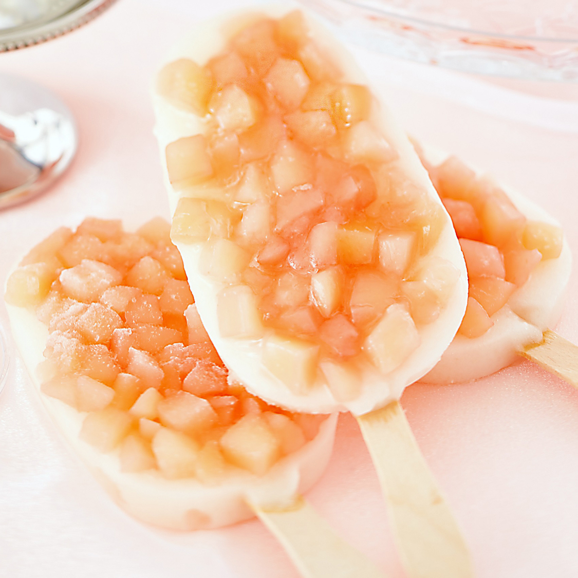 白桃の果汁をぎゅっと詰め込んだ白桃アイスバーに、白桃果肉をたっぷりトッピングした、ジューシーで味わい豊かなリッチな果実バー。