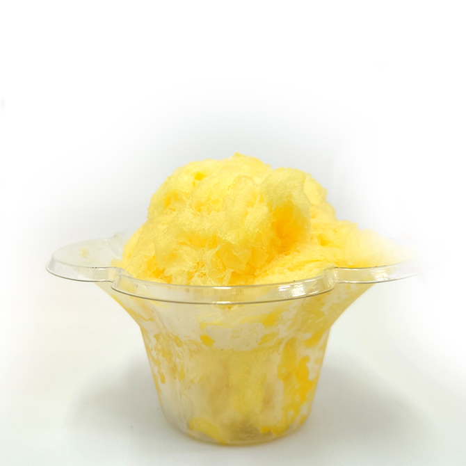 容器ごとスワン・SSB-1000 スノーブロッサムのアイスケースRにセットし、そのまま削れば、太陽の恵みをいっぱい受けた「果物の王様」マンゴーアイスかき氷の完成。