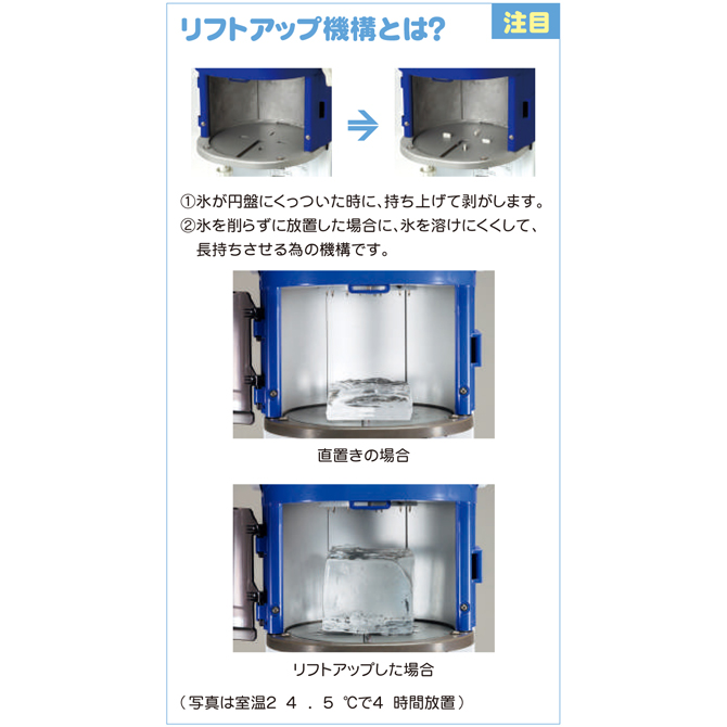 リフトアップ機構とは、氷を削らず放置した場合に氷が溶けにくく、長持ちさせる為の機構です。