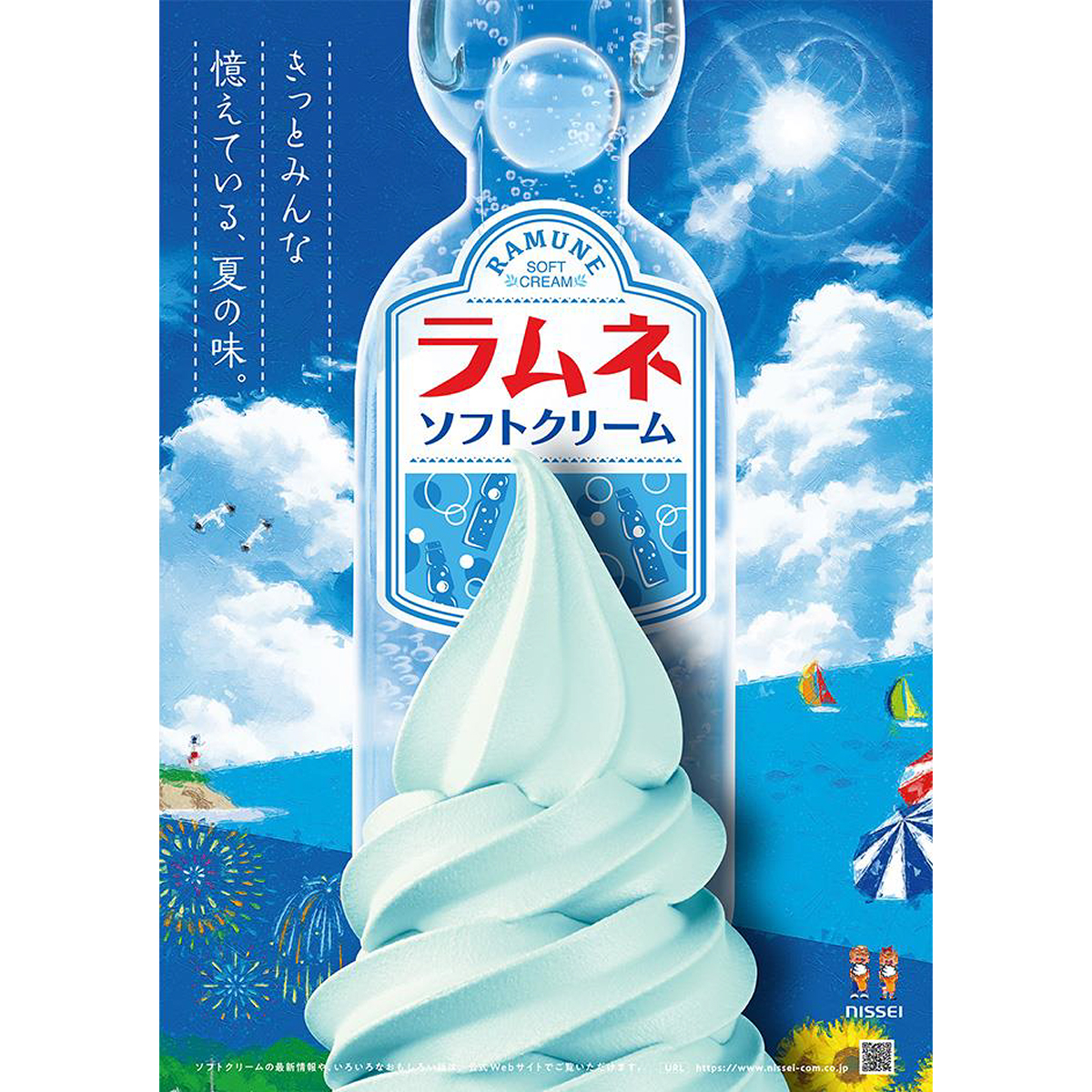瓶のガラス玉を押し下げると泡が吹き出す炭酸飲料のラムネの、独特の清涼感、さっぱり感をレモン果汁で演出した、特に夏向けのソフトクリームです。