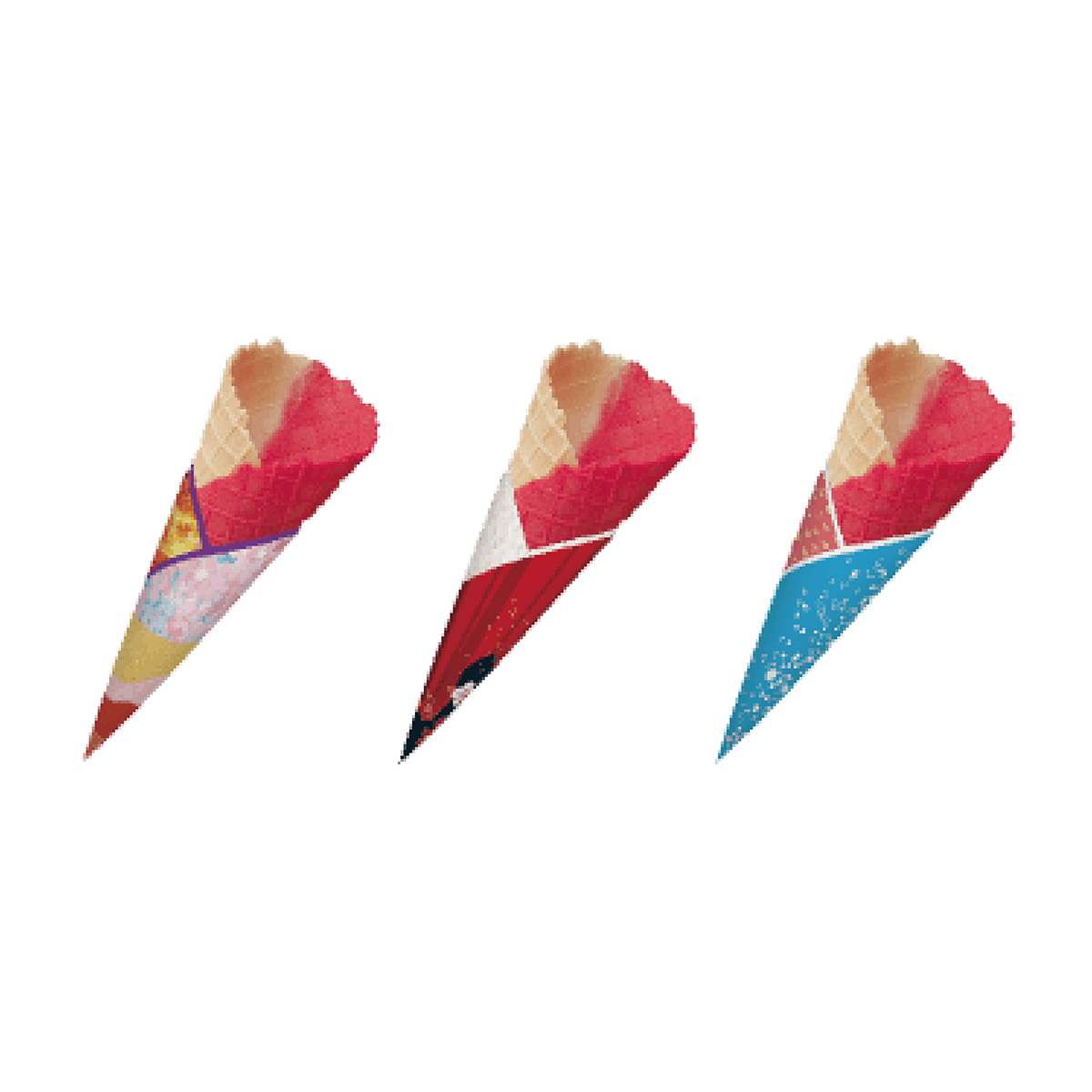日本の美しい情景や柄を、色彩や形状で表現した紅白ツートンコーン専用 のスリーブ。購入したお客様がSNS用に写真を撮ったり、食べ終わった後に旅行の思い出として持ち帰りたくなるようなデザイン(コーンは付属しません)。