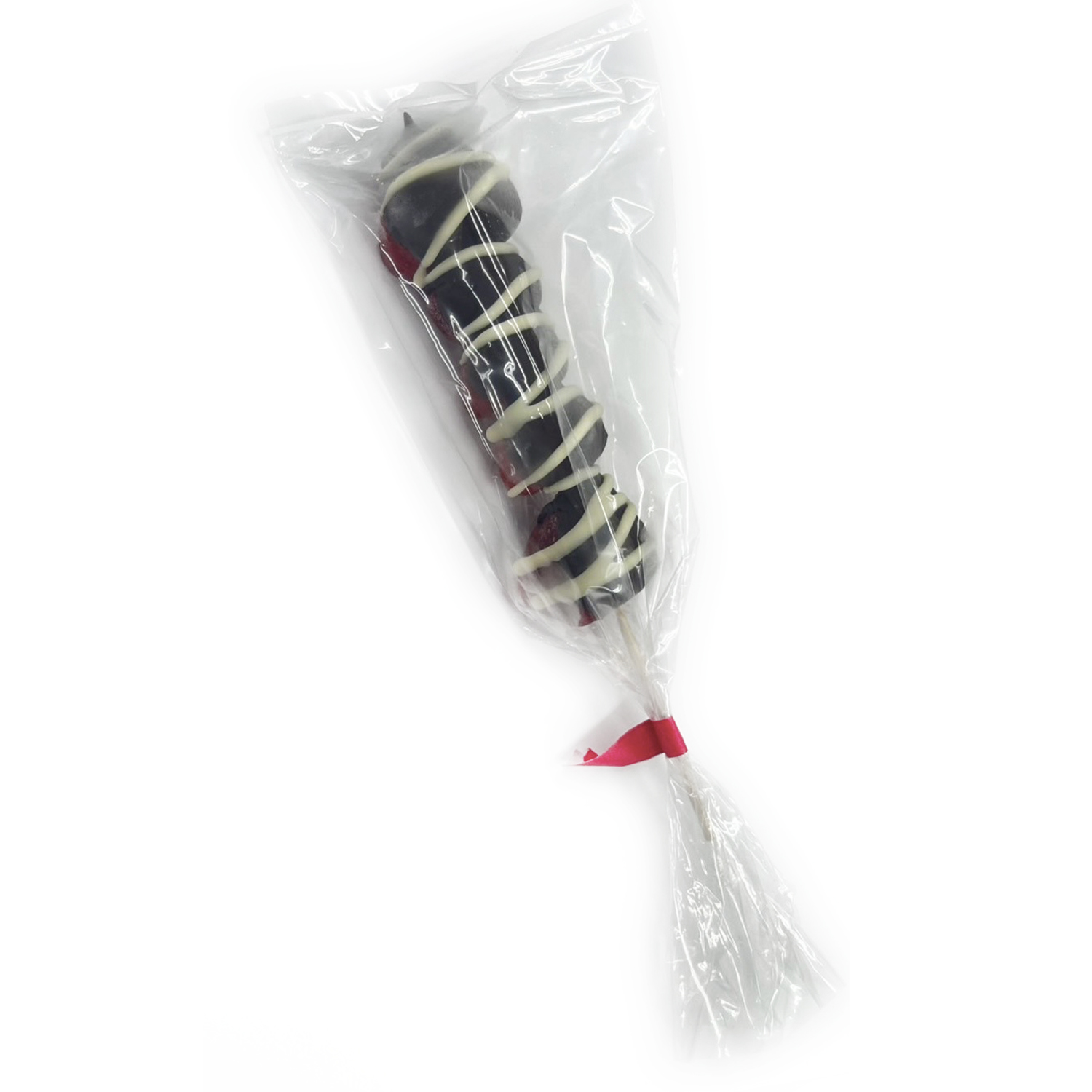 シロップ漬けしたいちごを串に刺し、半分だけチョコレートでコーティング